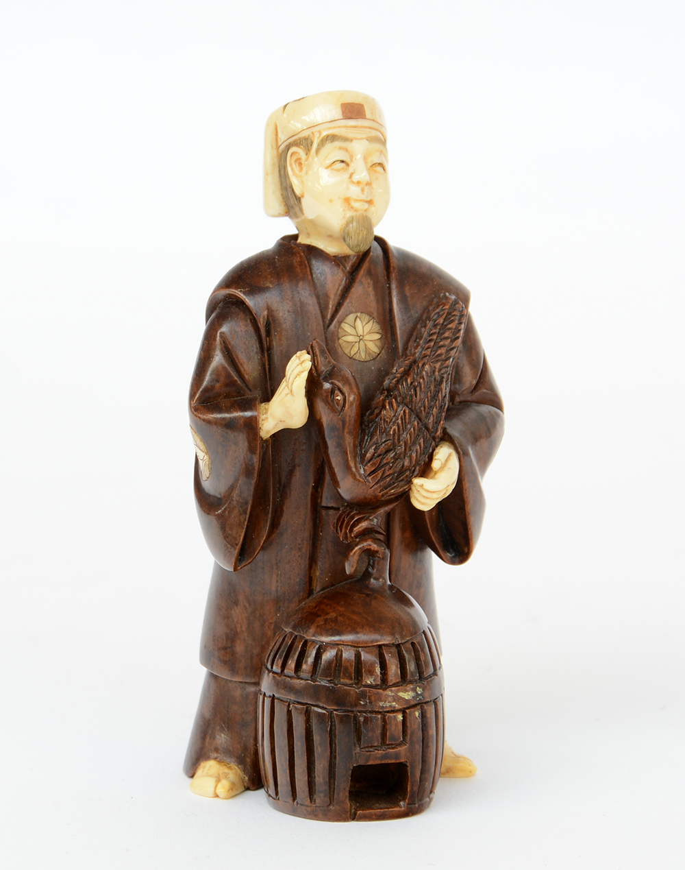 Okimono in legno e avorio raffigurante uomo con fenice (difetti) Giappone,...
