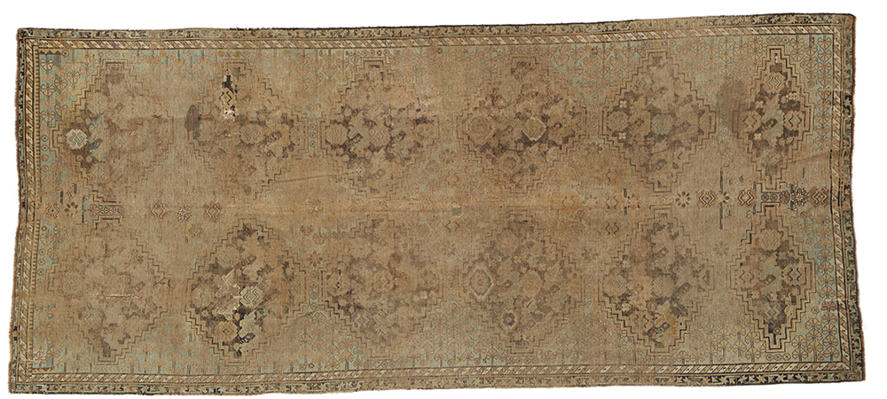 Tappeto Hila, Caucaso, inizio del sec. XIX, disegno a medaglioni romboidali ipetuti nei toni azzurro, beige e marrone (cm 365x160) (gravi difetti) Early 19th-century Hila Caucasian carpet (major defects) -EN Early 19th-century Hila Caucasian carpet (major defects)