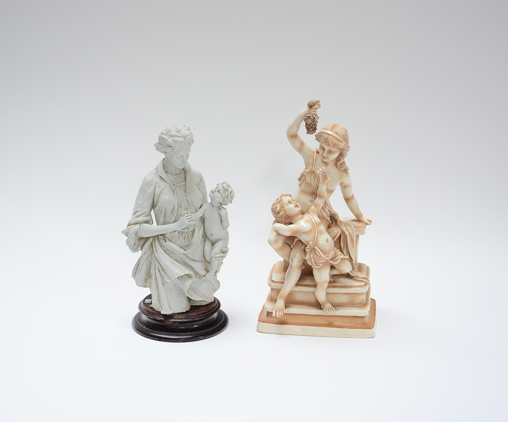 Lotto di due sculture in ceramica raffiguranti personaggi femminili con bambini (h max cm 39) (difetti e restauri)