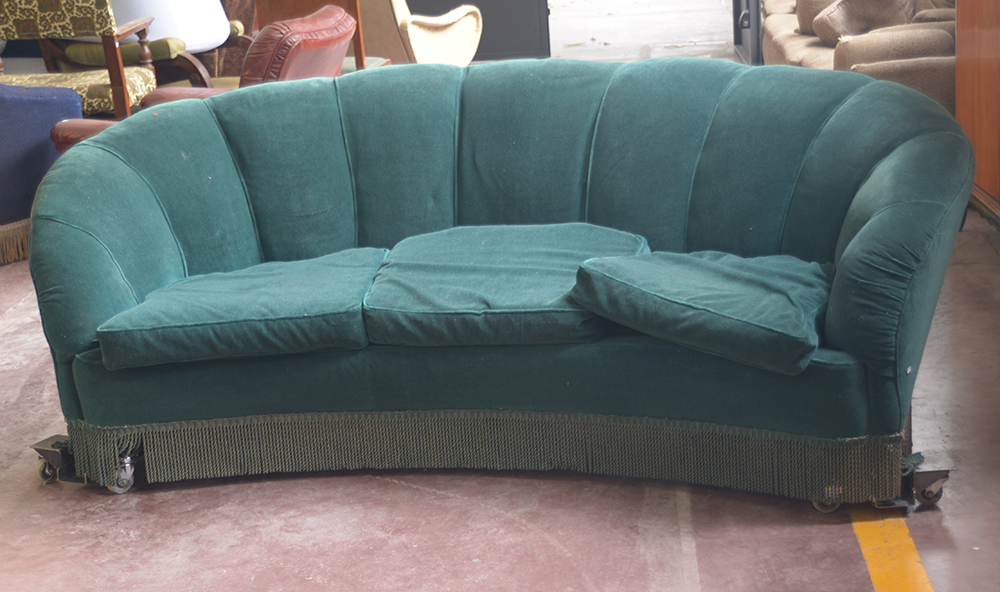 Divano a tre posti imbottito con schienale a conchiglia sagomata e fascia...