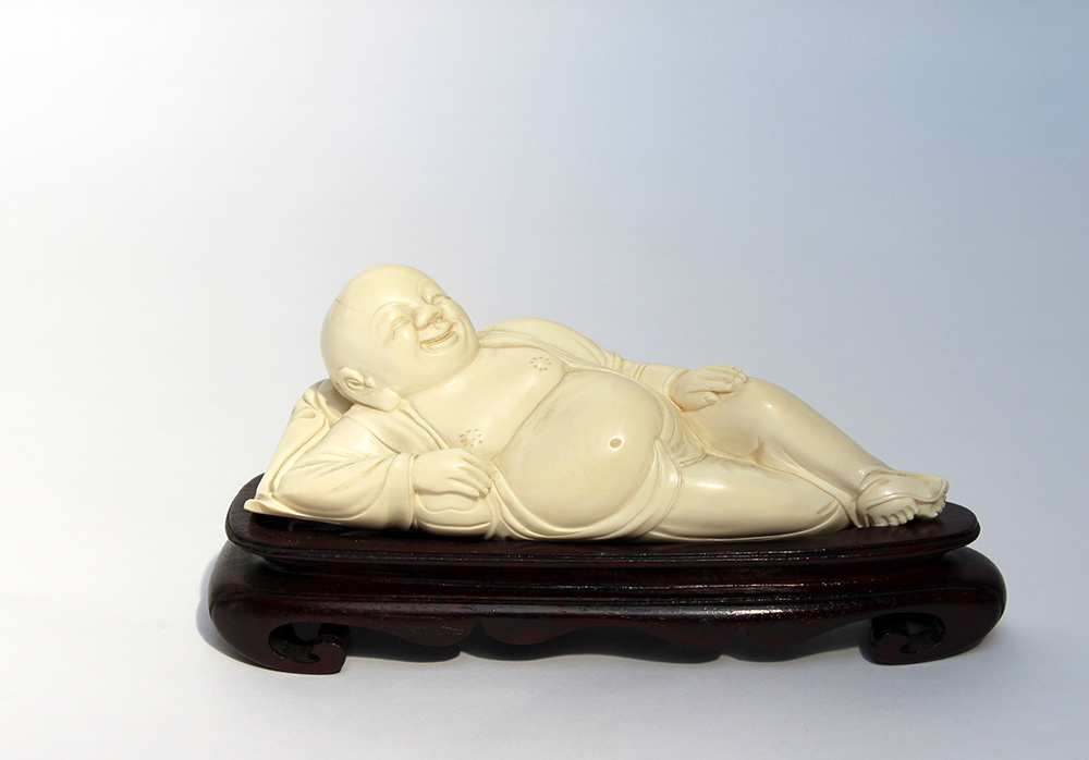 Buddha in avorio raffigurato sdraiato, base in legno (lievi difetti) Cina,...