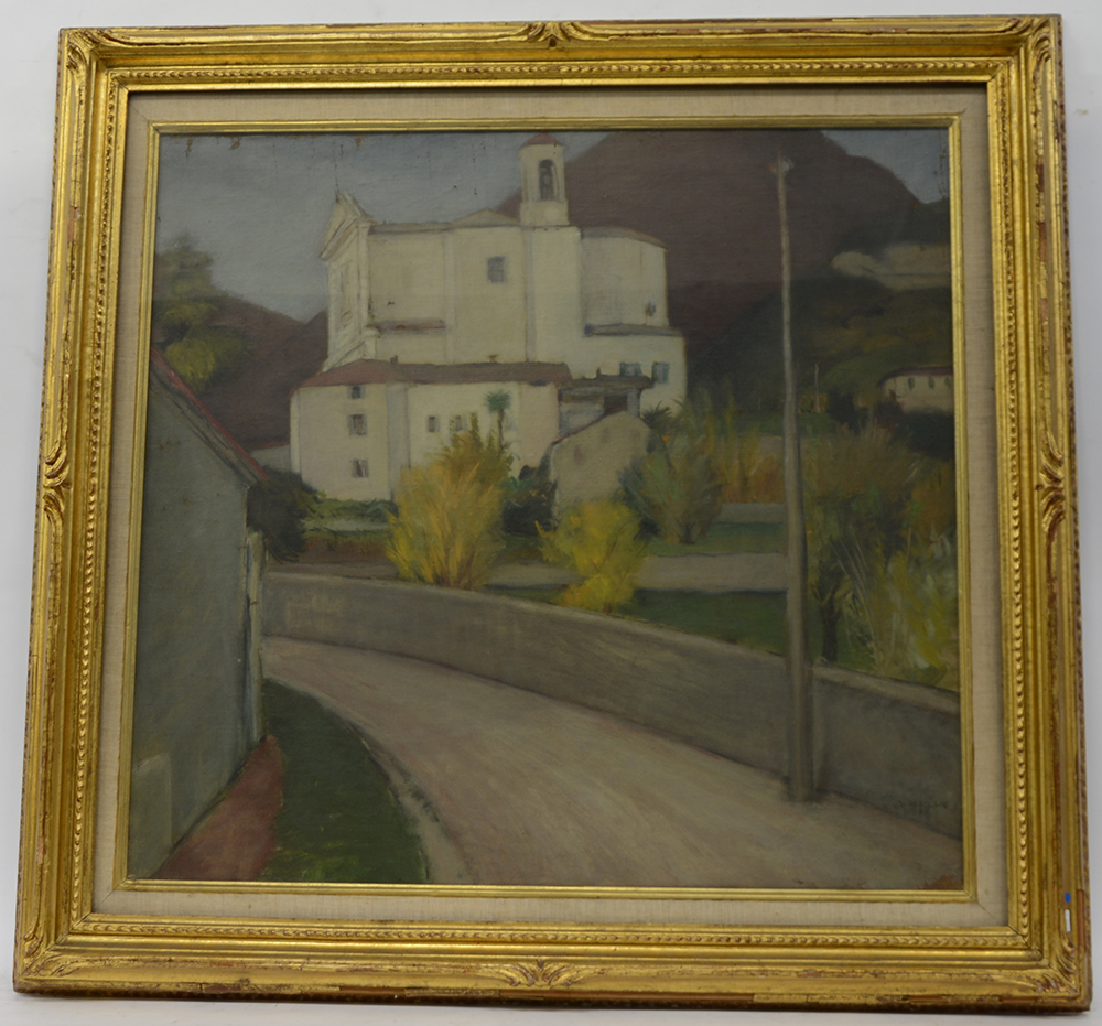 S. Debellis "Strada verso la chiesa" 1935, olio su tela (cm 65x70) Firmato e datato in basso a destra, in cornice (difetti)