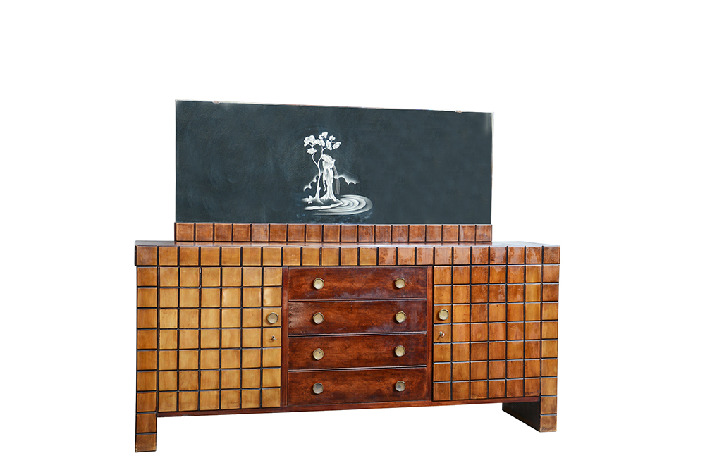 Buffet con fronte decorata a bugne, due sportelli e quattro cassetti nella parte centrale, sormontato da specchiera. Prima metà del secolo XX (cm 221x174x51) (difetti)