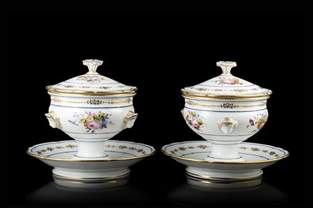 Manifattura Popov, Mosca, secondo quarto del secolo XIX. Coppia di piccole zuppiere con coperchio in porcellana policroma decorata a bouquets di fiori e profili mistilinei dorati. Tre maschere femminili in rilievo sul corpo e pomolo in forma di fiore. Marchio di fabbrica sotto la base. Poggianti su piatti forati e avvitati in epoca posteriore (h. cm 19) (lievi difetti, mancanti dei cucchiai)Provenienza:Christie's New York, asta 12197, 23 agosto 2016, lotto 271 -EN Popov manufacture, Moscow, second quarter of the 19th century. A pair of polychrome porcelain tureens with lids (h. cm 19) (minor defects, spoons are missing) Provenance: Christie's New York, sale 12197, 23 August 2016, lot 271