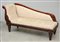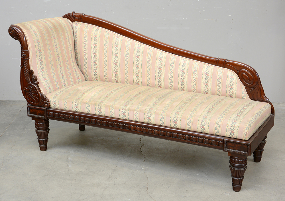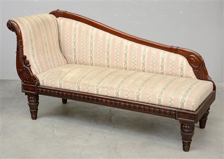 Dormeuse in legno intagliato con seduta e schienale rivestiti in tessuto a righe (difetti)