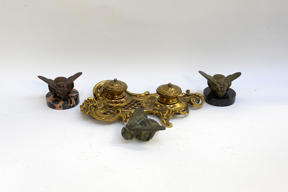 Lotto composto da un calamaio in bronzo dorato e tre fermacarte a forma di api, due su base in marmo (difetti)