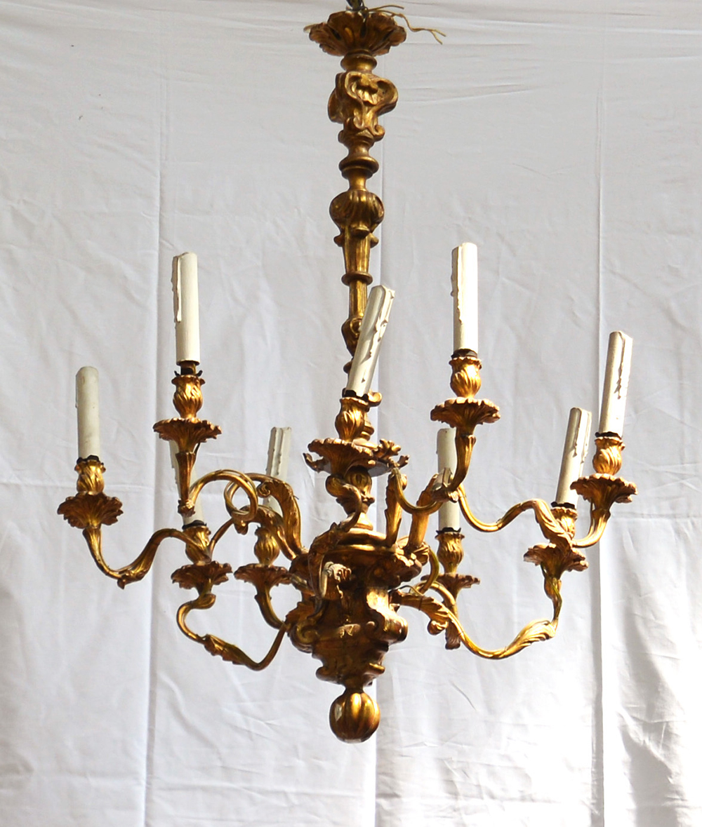 Lampadario a nove luci in legno dorato ed intalgiato decorato a foglie, volute e riccioli