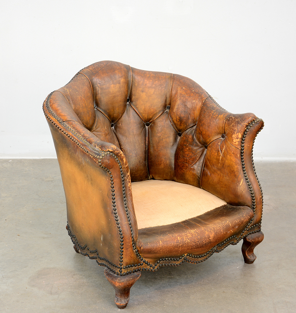 Poltrona da bambino in pelle con braccioli e schienale sagomato, gambe mosse e intagli. Secolo XIX (mancante del cuscino)