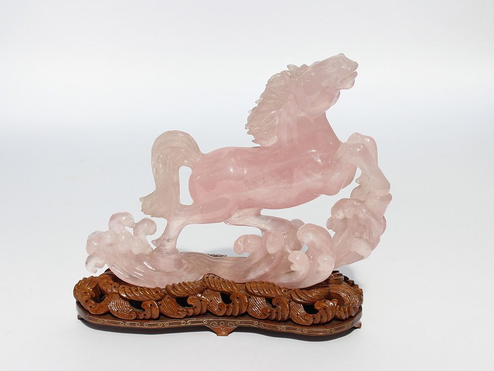 Scultura in quarzo rosa raffigurante cavallo, base in legno (difetti) Cina,...
