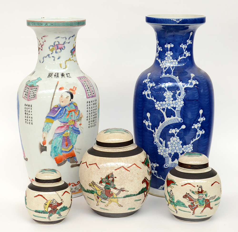 Lotto composto da due vasi a balaustro in porcellana policromia, uno decorato con personaggi dello Wu Shuang Pu e tre potiches con dimensioni a scalare in smalti Famiglia Verde su fondo crequelé (difetti) Cina, sec. XX (h. max 46,5 cm.)
