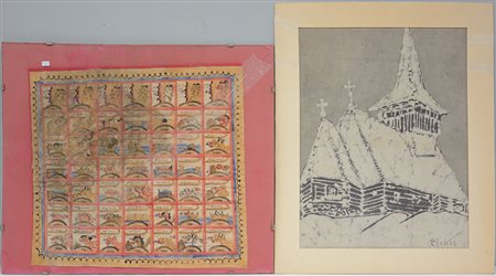 Lotto di due tessuti uno Batik in tonalità di grigio ed uno dipinto in policromi a riquadri con scritte balinesi, secolo XX. (varie misure) (difetti)