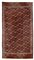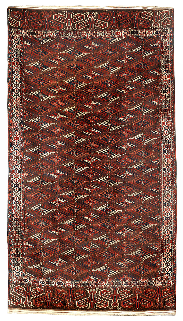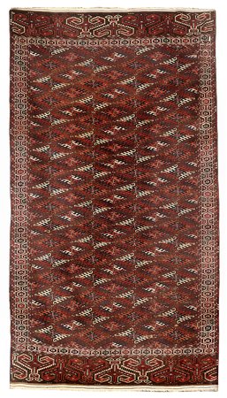 Tappeto Yomut, Turkestan occidentale, inizio secolo XX. Disegno con file di Kepse Gul uncinati su fondo bordeaux scuro. Bordura principale con C Gùl. Grandi Elem con le Aquile Yomut. Testate ben conservate con il kilim originale color crema decorato da una riga in rosso e bordeaux . (cm 365x194) (difetti) -EN Early 20th century Yomut carpet, West Turkestan. Kepse Gul pattern. Large Elem with Yomut Aigles. Well preserved heads and selvedges.(cm 365x194) (minor defects)