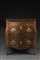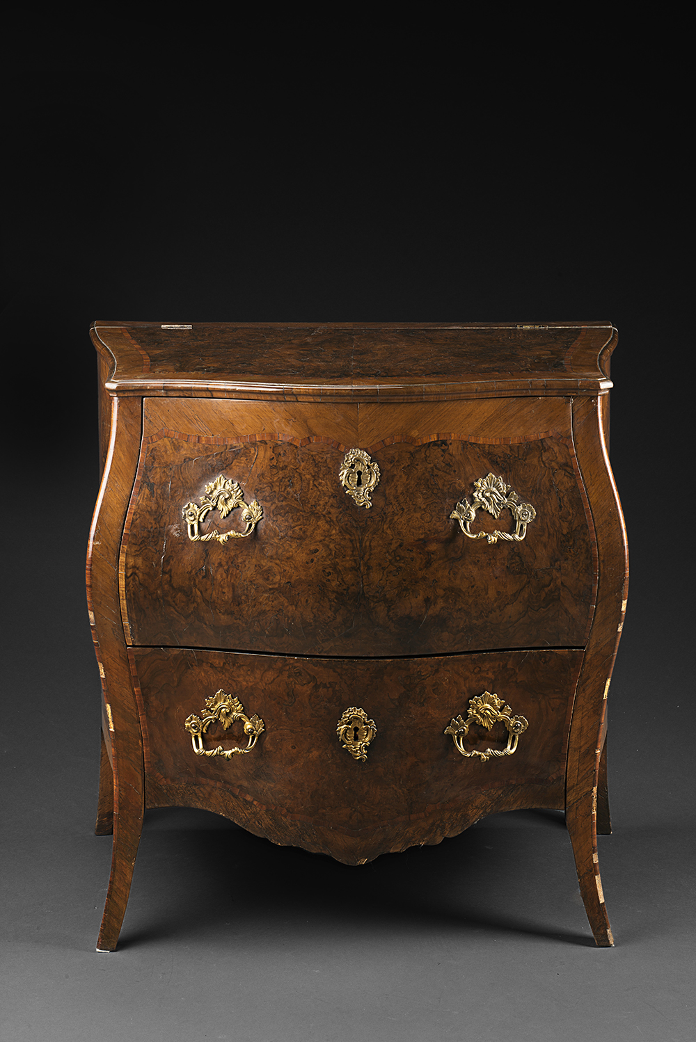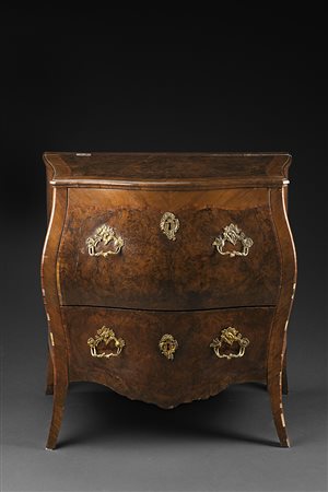 Madia di forma bombata lastronata in radica di noce e filettata in bois de rose. Piano apribile, due cassetti sul fronte. Piedi a sciabola. Maniglie e bocchette in bronzo Genova sec. XVIII (cm 53x88x88) (restauri e mancanze) -EN Burr walnut veneered and rosewood inlaid sideboard (cm 53x88x88) (restorations and minor losses)