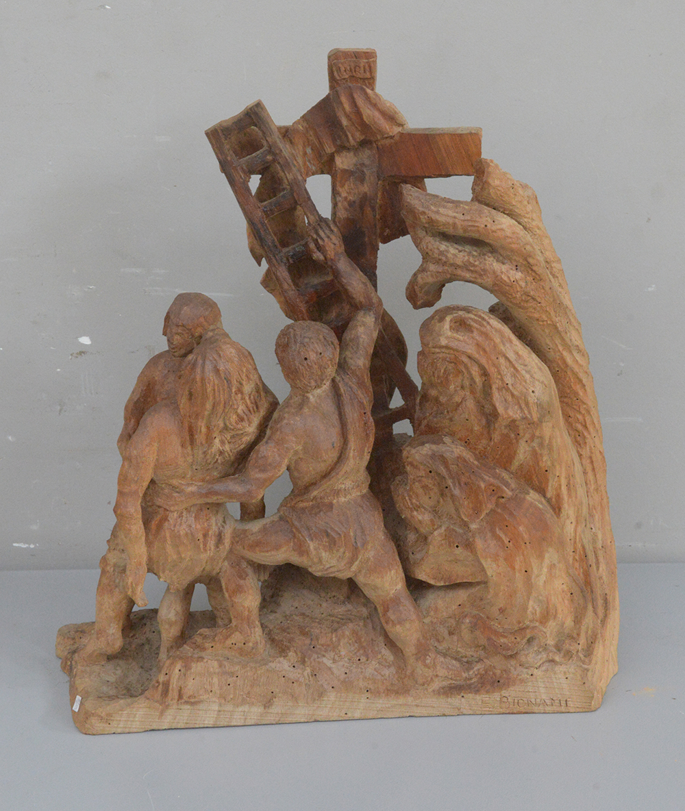 E. Bignami "Deposizione" gruppo in legno scolpito (h cm 47) firmato in basso a destra