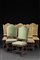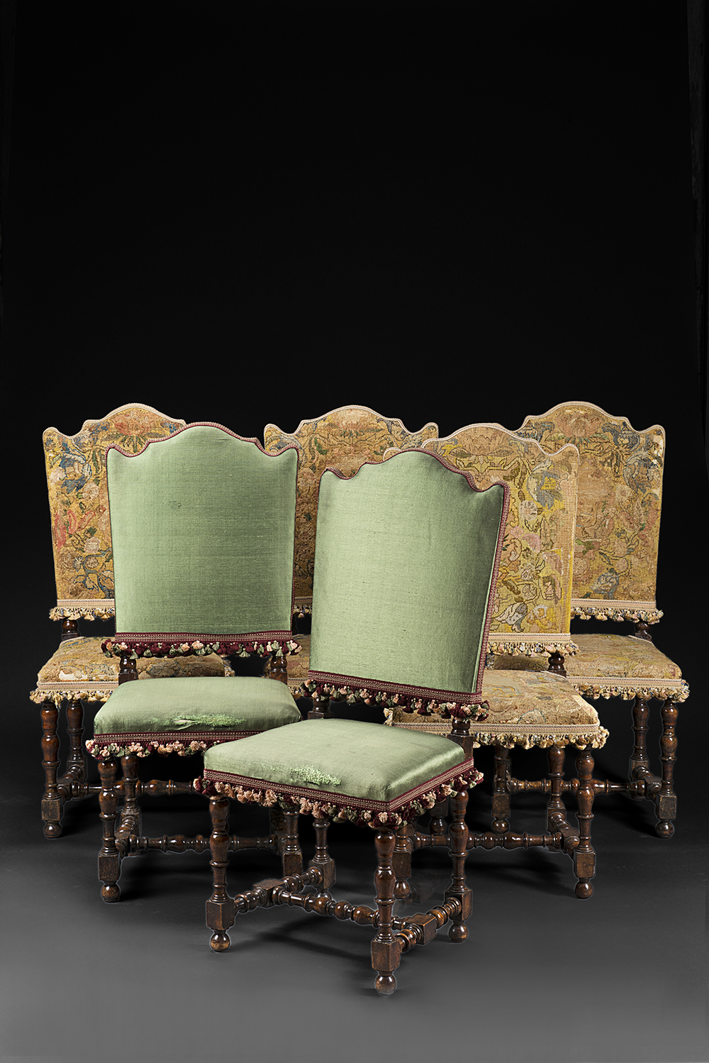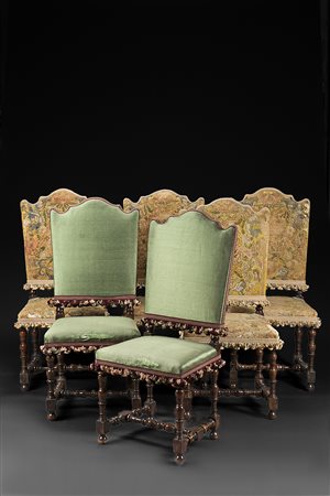Gruppo di sei sedie a rocchetto in noce con gambe tornite e unite da traverse, due rivestite in seta verde e quattro in tessuto a piccolo punto. Sec. XVII (difetti al tessuto e lievi differenze) -EN Group of six 17th-century walnut chairs (defects to the fabric and minor differences)