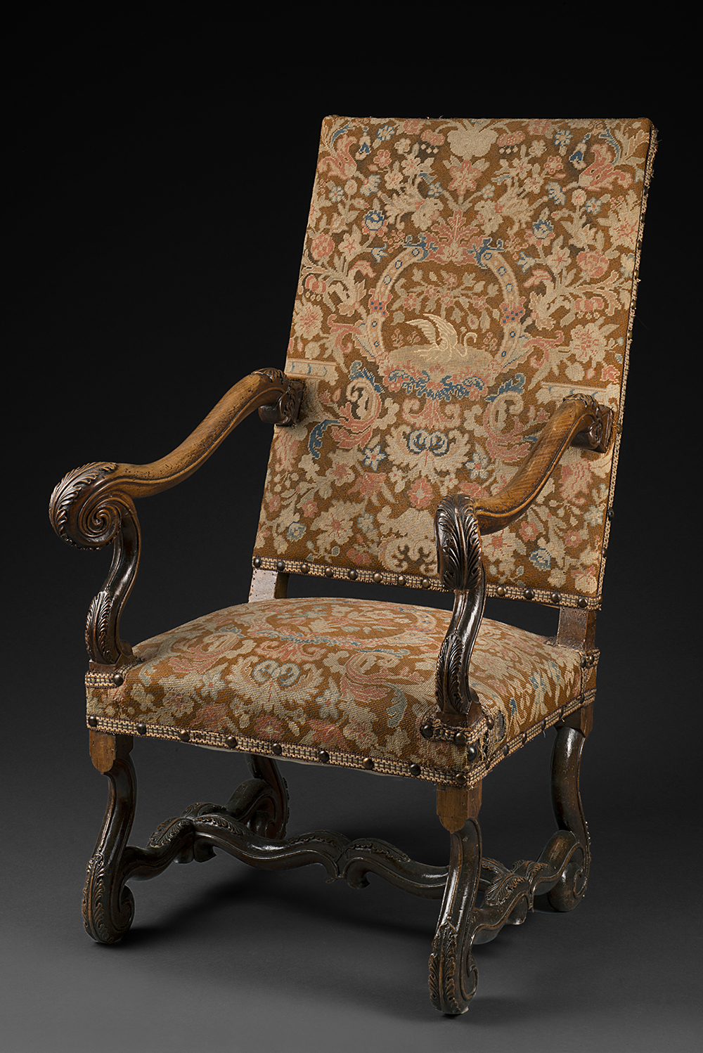 Seggiolone in noce con braccioli e gambe mosse intagliate a foglie d'acanto. Gambe a osso di montone unite da traversa. Rivestito in tessuto a piccolo punto. Sec. XVII Provenienza: Nella Longari Antichità, etichetta cartacea -EN 17th-century walnut armchair covered in needlepoint fabric