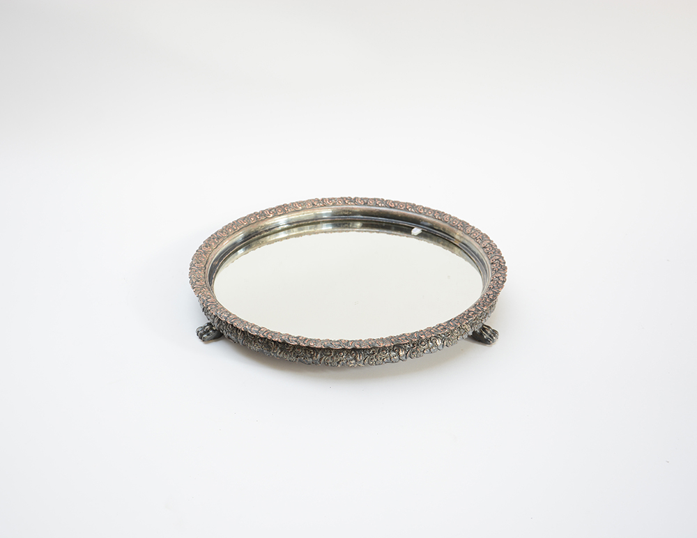 Centrotavola tondo a specchio con cornice in metallo decorata con fiori in rilievo poggiante su zampe ferine (d cm 37,5) (lievi difetti)