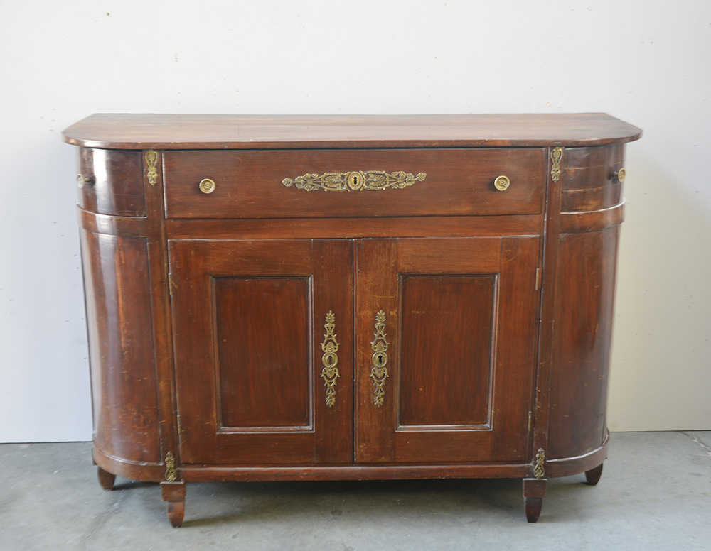 Credenza con angoli arrotondati a tre cassetti e due sportelli decorata con applicazioni in bronzo (cm 140x98x54) (difetti)