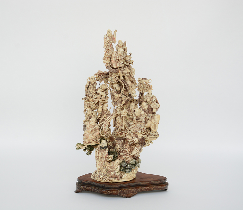 Gruppo scultoreo in avorio raffigurante immortali taoisti e figure fantastiche, base in legno (difetti, restauri e mancanze) Cina, sec. XX (h. 51 cm.) -EN .