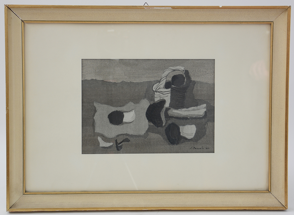 Epifanio Pozzato (Biella 1931) “Natura morta”, 1965, tecnica mista (cm 19x27), firmato e datato in basso a destra, in cornice, (difetti)