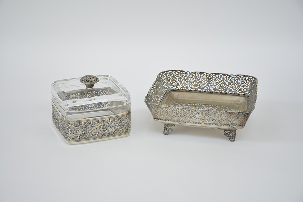 Lotto composto da un'alzatina in argento e una scatola portadolci in vetro con ghiera in argento (cm max 20) (g 410 ca.)