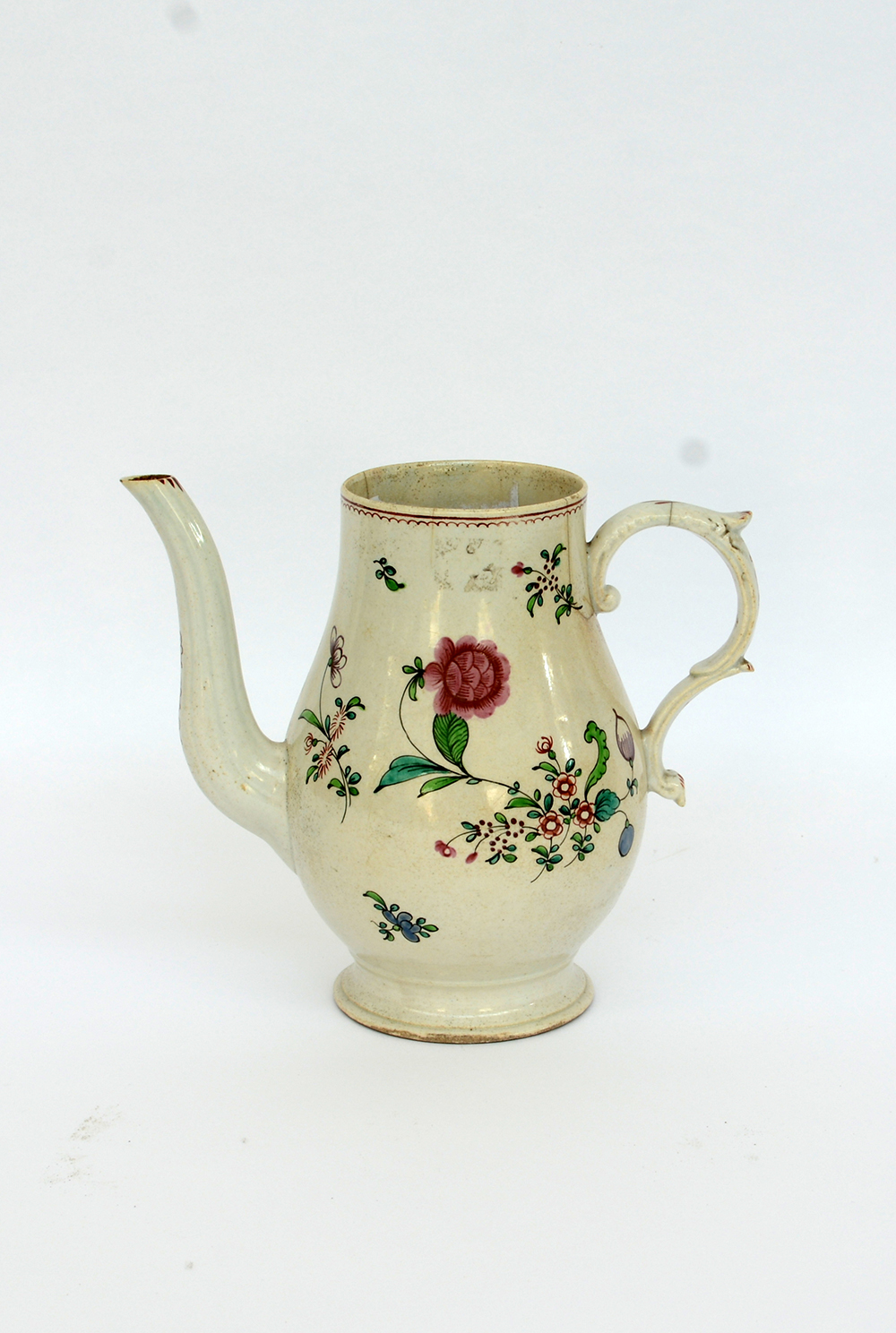Caffettiera in terraglia policroma con decorazione a fiori, mancante del coperchio (h cm 20) XIX secolo (difetti e restauri)