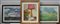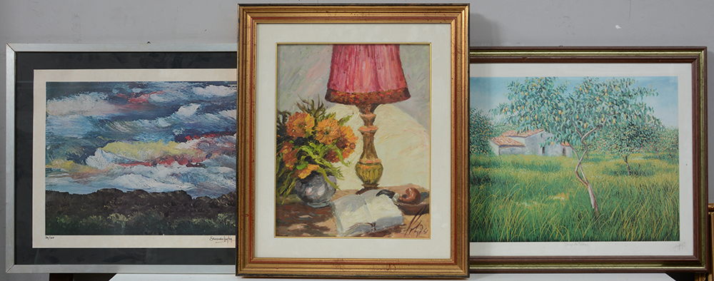 Lotto composto da un dipinto ad olio raffigurante vaso con fiori, lampada e libro, e due riproduzioni raffiguranti paesaggi, autori e misure differenti, in cornici