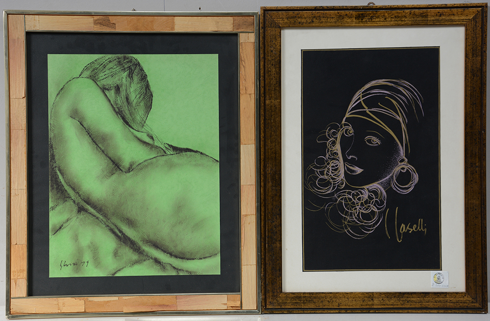 Lotto di due quadri raffiguranti un nudo e un volto femminile, autori, tecniche e misure differenti, in cornici (lievi difetti)