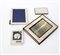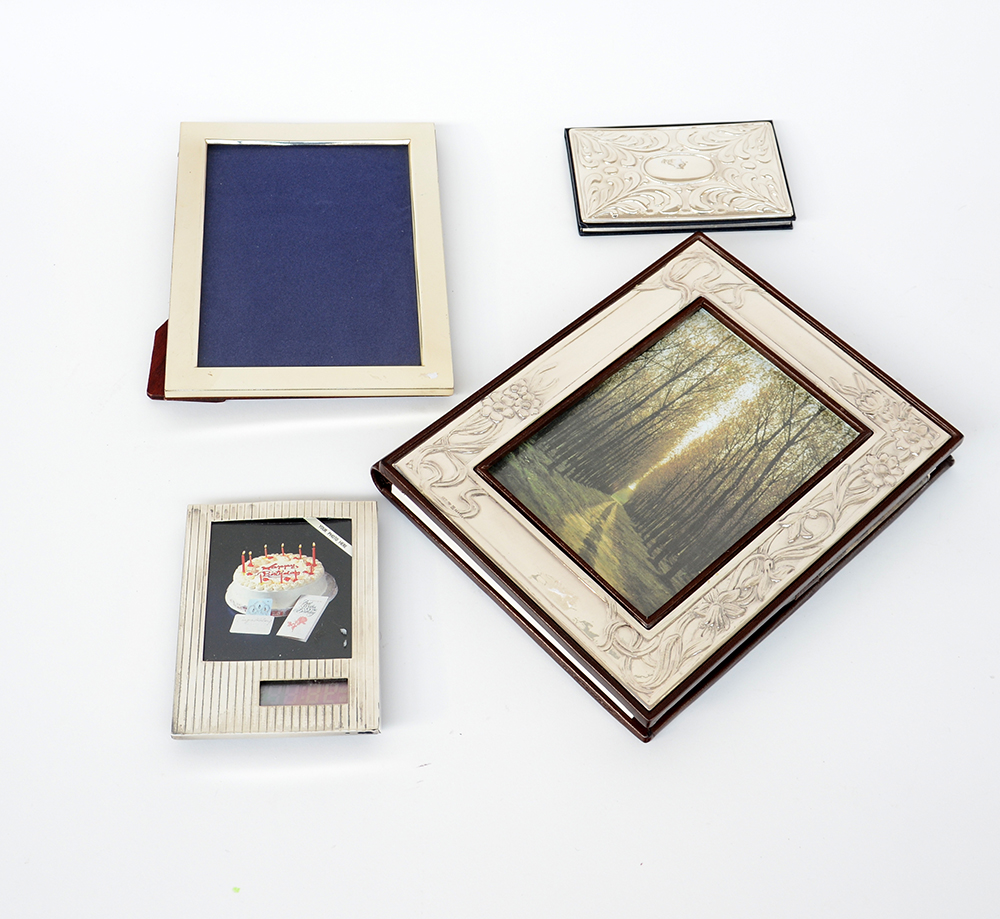 Lotto composto da una cornice, una cornice con sveglia, una cornice con block-notes e una piccola rubrica rivestiti in argento e metallo argentato (lievi difetti)