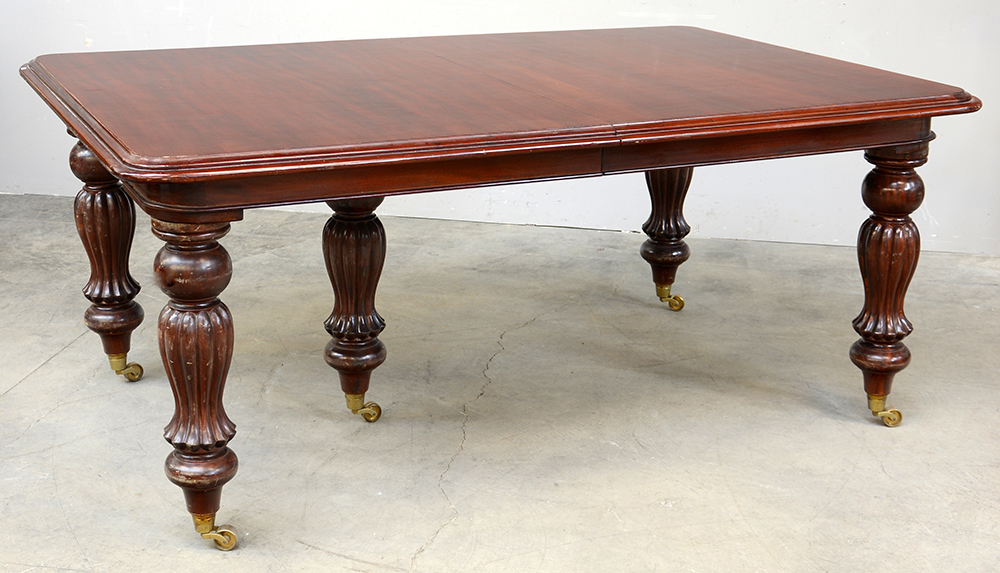 Tavolo rettangolare allungabile, gambe a balaustro tornite e scanalate munite di rotelle, secolo XX (cm 180x78x120) (difetti e mancanze)