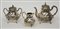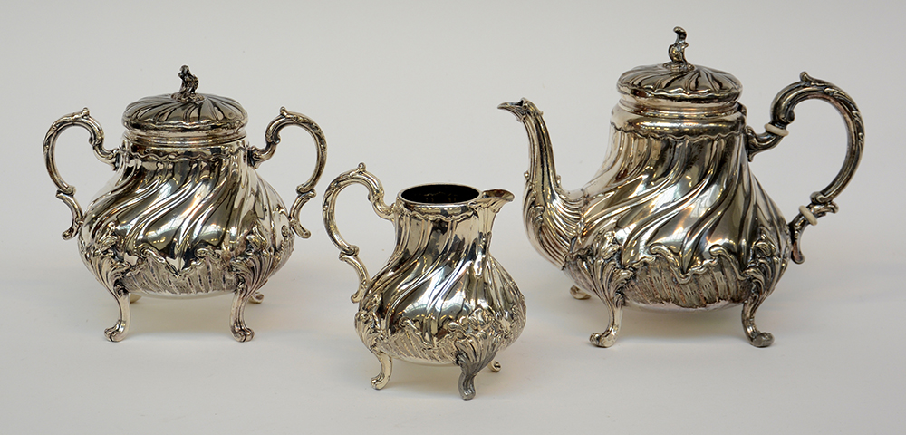 Servizio da tè composto da una teiera, una lattiera e una zuccheriera in metallo argentato decorato in rilievo e motivo a spirale (lievi difetti)