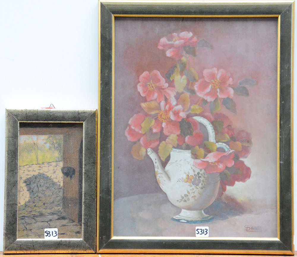 Lotto composto da un dipinto ad olio su compensato raffigurante una brocca con fiori, firmato L. Sambo, ed un pastello su cartoncino raffigurante uno scorcio di androne, firmato Curty, locato e datato 1937 al verso. In cornici ( lievi difetti)