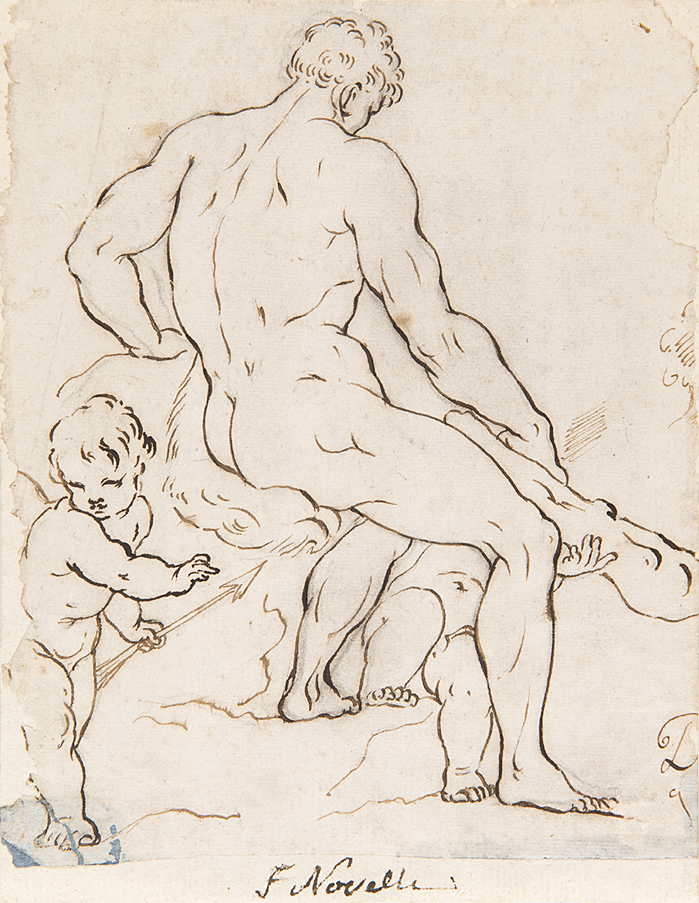 Artista del secolo XVIII "Ercole con amorini" penna e inchiostro bruno su tracce a matita nera (mm 185x150) (difetti, controfondato) -EN Fragment of drawing