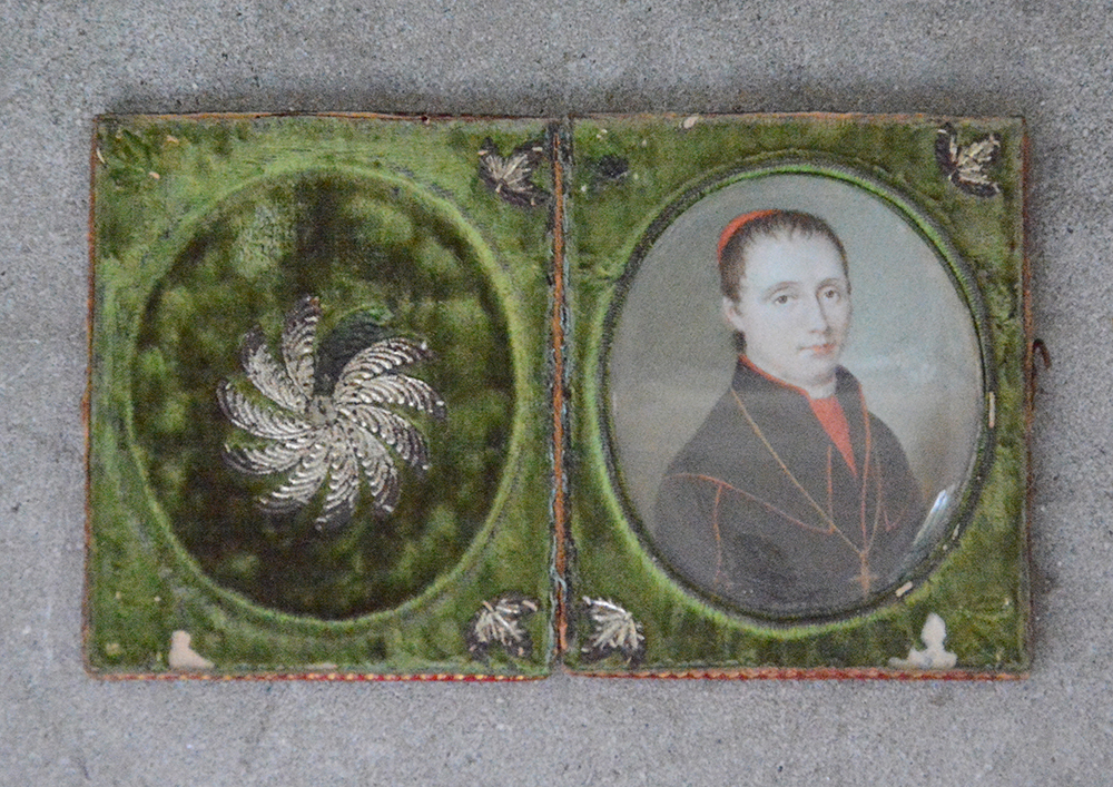 Maestro del secolo XIX "Ritratto di prelato" miniatura ovale (cm 7x5,5) in custodia in pelle impressa in oro (difetti)