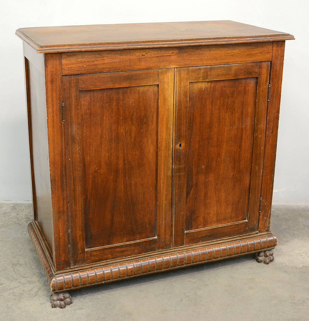 Credenza a due ante con fascia inferiore dentellata e piedi anteriori intagliati a zampa ferina (cm 98x100x50) (difetti)