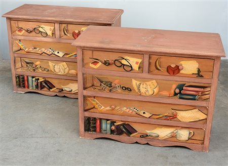 Coppia di comò a tre cassetti più due in linea sottopiano decorati a trompe l'oleil in policromia (cm 105x80x48) (difetti)