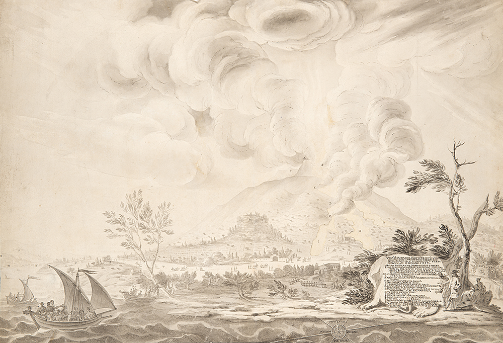 Anton Clemens Lunenschloss (Dusseldorf 1678 - Wurzburg 1763) "Vera veduta del monte Vesuvio coll'ultimo spaventoso incendio... del 1717" penna e inchiostro grigio acquerellato in grigio, cartiglio iscritto in basso a destra (mm 460x670) -EN "Vera veduta del monte Vesuvio coll'ultimo spaventoso incendio...del 1717" pen and grey ink washed grey, inscribed cartouche bottom right (mm 460x670)