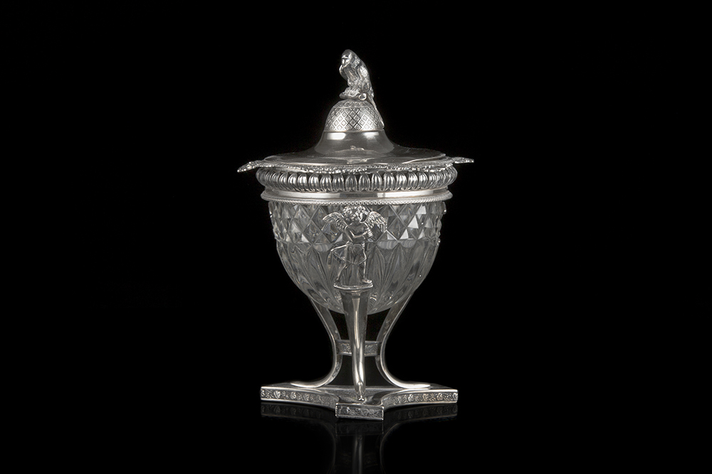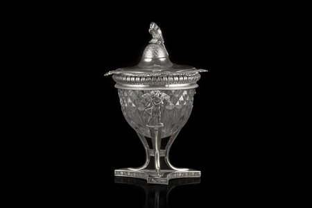 Zuccheriera in argento con coppa in vetro baccellato e bugnato sorretta da tripode con montanti in figura di amorini su plinto triangolare falcato e ghiera con occhielli traforata a foglie; decori a fasce di motivi floreali ed ornati stilizzati; presa a tutto tondo in figura di rapace. Regno Lombardo-Veneto, Milano, 1812-50. Argentiere Emanuele Caber (h. cm 20 ca.) (g lordi con vetro 550 ca.) (difetti) -EN A silver sugar bowl with glass cup. Kingdom of Lombardy-Venetia, Milano, 1812-50. Silversmith Emanuele Caber (h. cm 20 ca.) (gross g with glass 550 ca.) (defects)