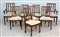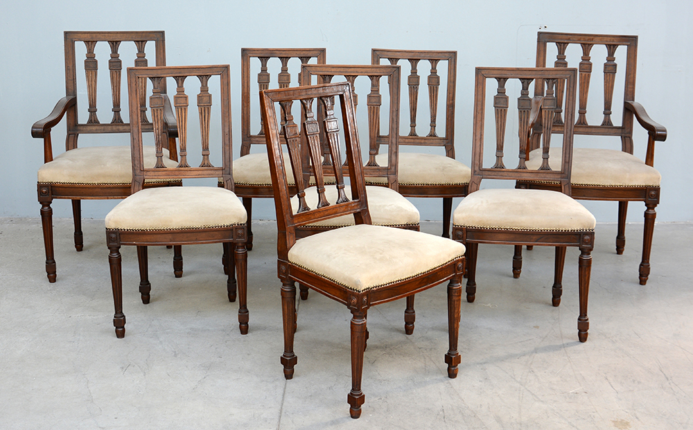 Gruppo di otto sedie, di cui due da capotavola con braccioli, gambe rastremate, schienale a giorno con cartelle sagomate e sedute imbottite (difetti)