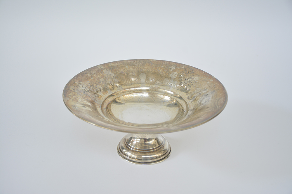 Alzata in argento di forma circolare con tesa sbalzata a foglie e frutti....