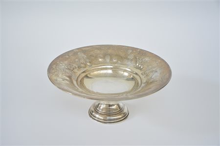 Alzata in argento di forma circolare con tesa sbalzata a foglie e frutti. Palermo, manifattura moderna (g 200 ca.) (d. cm 23,5) (lievi difetti)