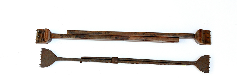 Lotto composto da due misure per tessuti in legno e ferro (l cm max 52 ca) -EN Two wooden/iron cloth measures