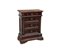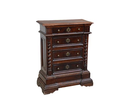 Comodino in noce a quattro cassetti decorato sul fronte con mezze colonne...