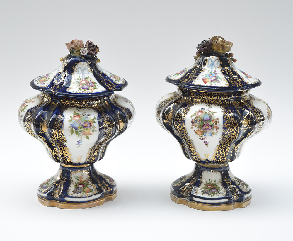 Coppia di vasi con coperchi di forma polilobata decorati con mazzi di fiori...