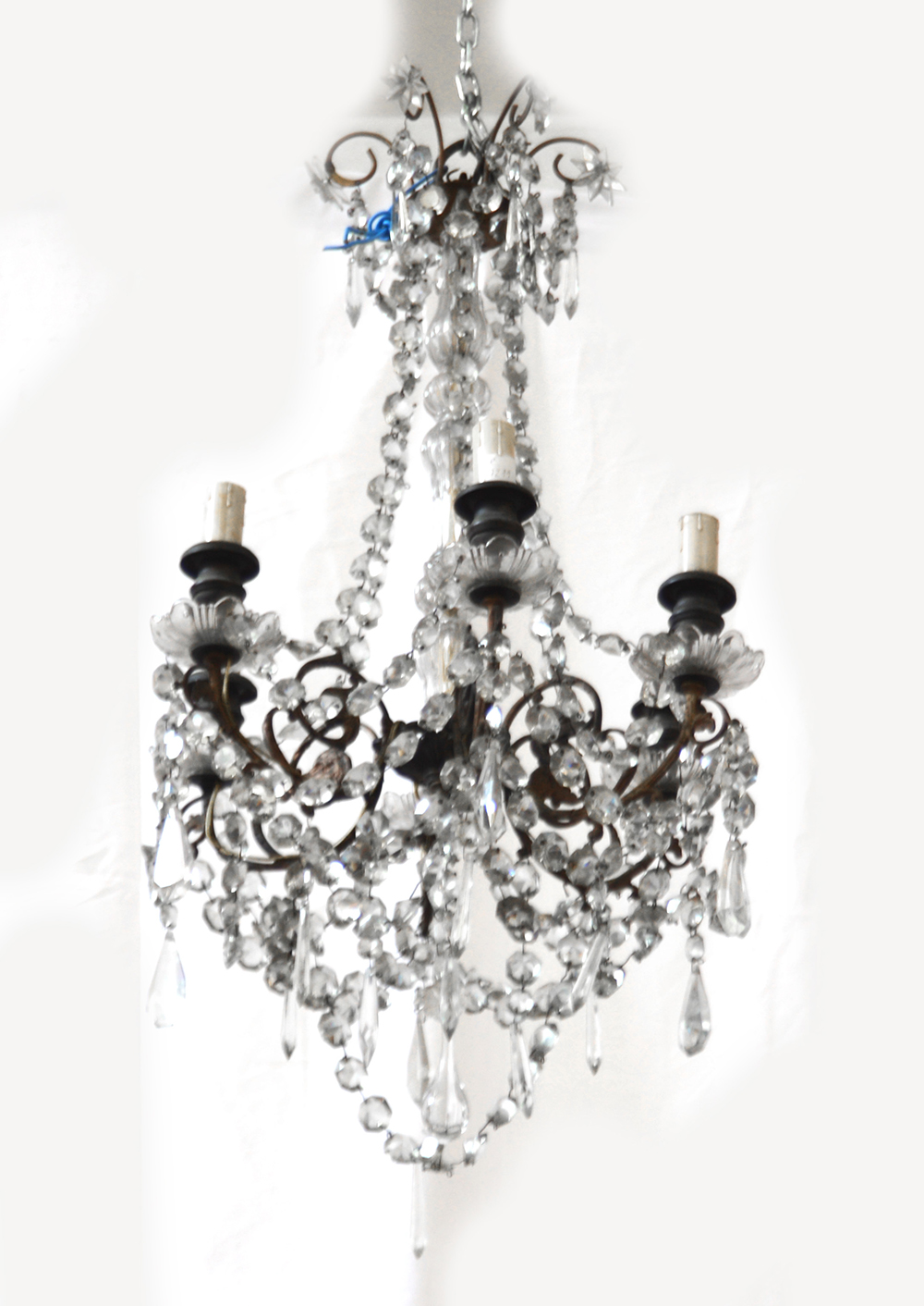 Lampadario a sei fiamme in metallo con perlinature e asta in vetro (h. cm 80) (difetti e mancanze)