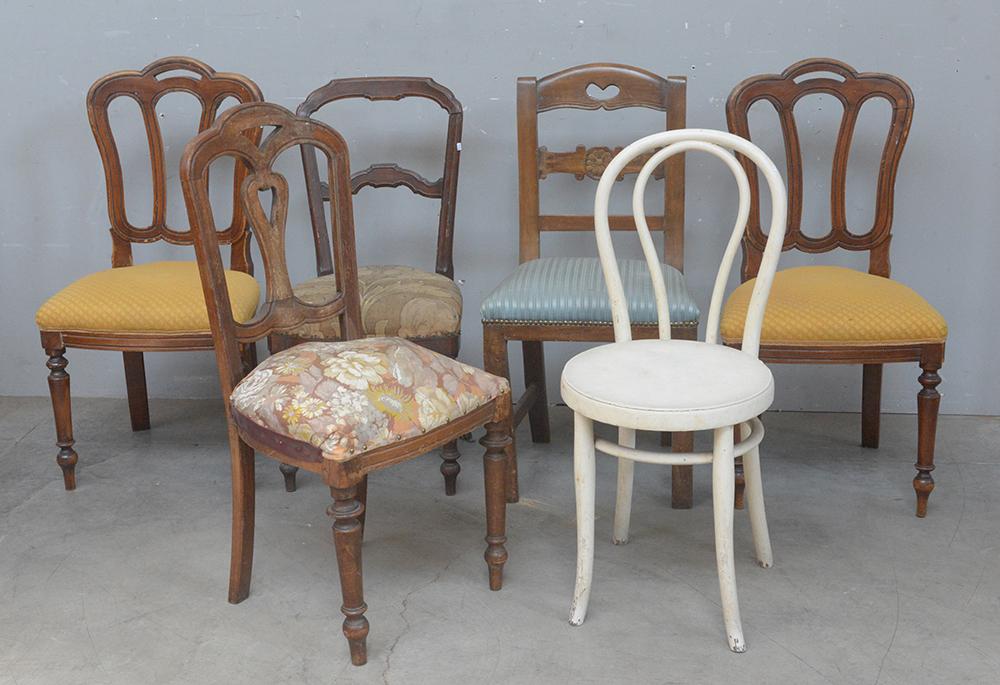 Lotto composto da sei sedie in legno di fattura e legni diversi (difetti e mancanze)