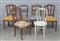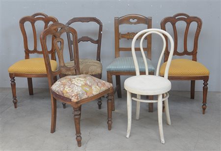 Lotto composto da sei sedie in legno di fattura e legni diversi (difetti e...