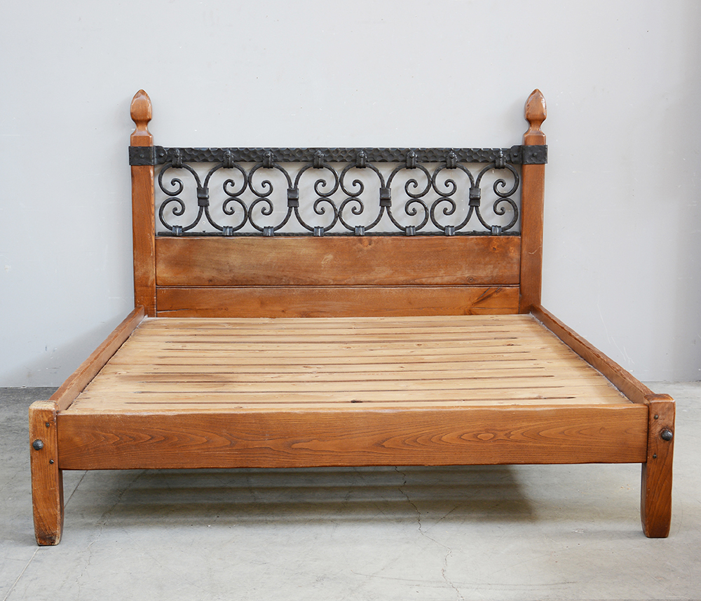 TARPAC (Alto Artigianato Toscano) Letto matrimoniale in legno massello con testata decorata da fregio in ferro battuto a riccioli, marcata TP dietro la testata (difetti)