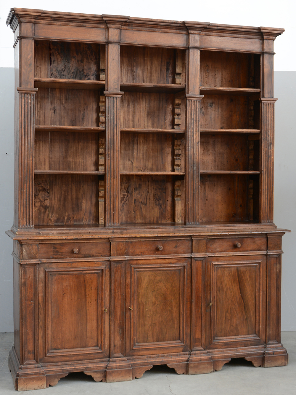 Libreria a due corpi, parte superiore con ripiani a giorno, parte inferiore a tre cassetti e tre ante riquadrate, piedi a mensola (cm 182x133x48)(difetti)