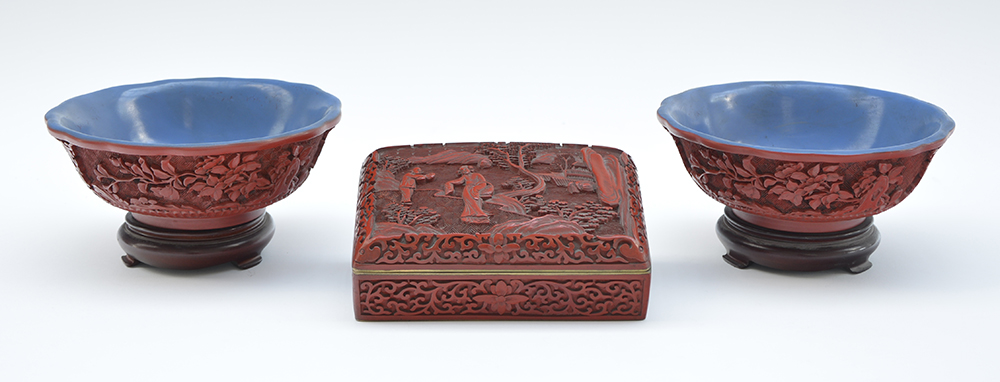 Lotto composto da due ciotole ed una scatola con coperchio ad imitazionie di lacca rossa con decorazione incisa, due basi in legno (lievi difetti) Cina, sec. XX (d. max 16,5 cm.)